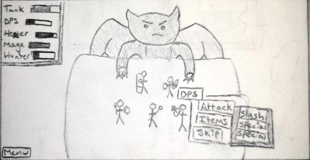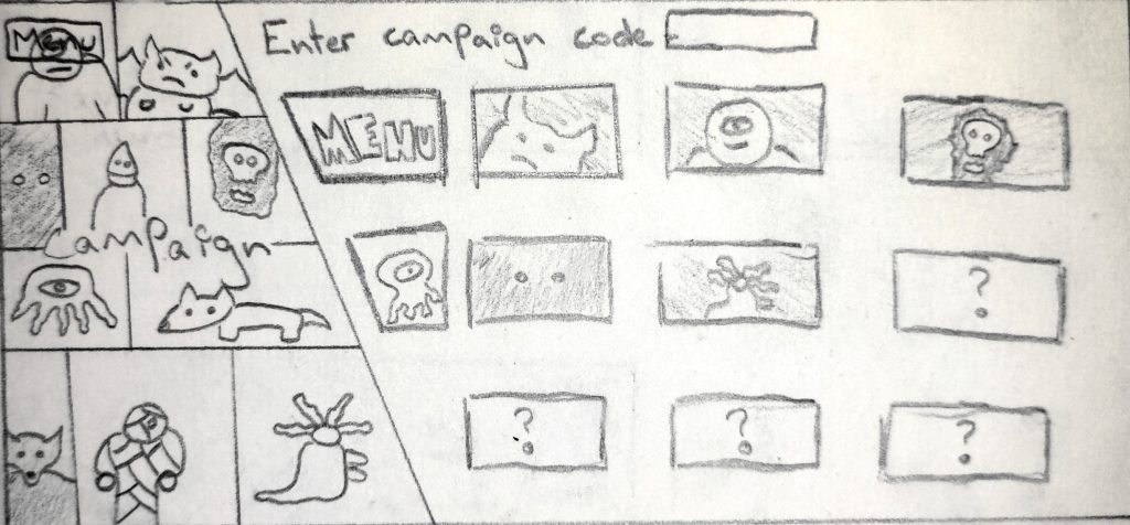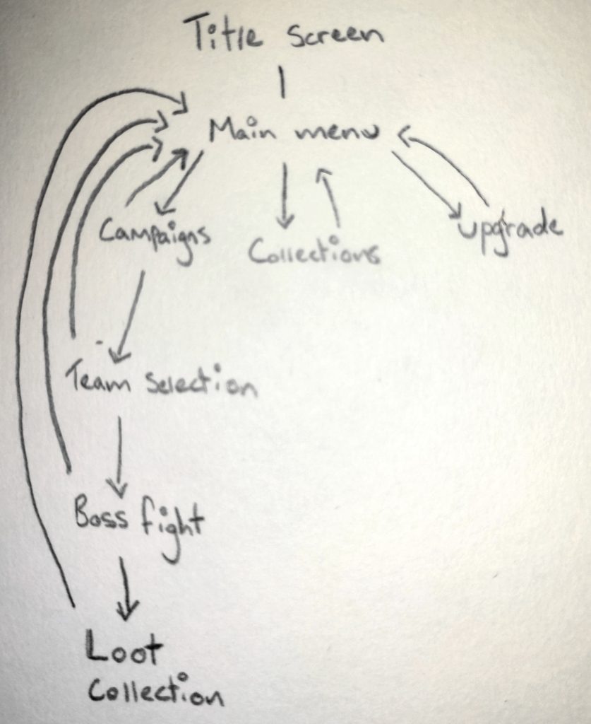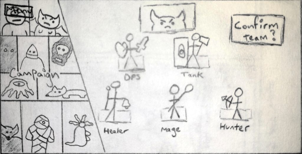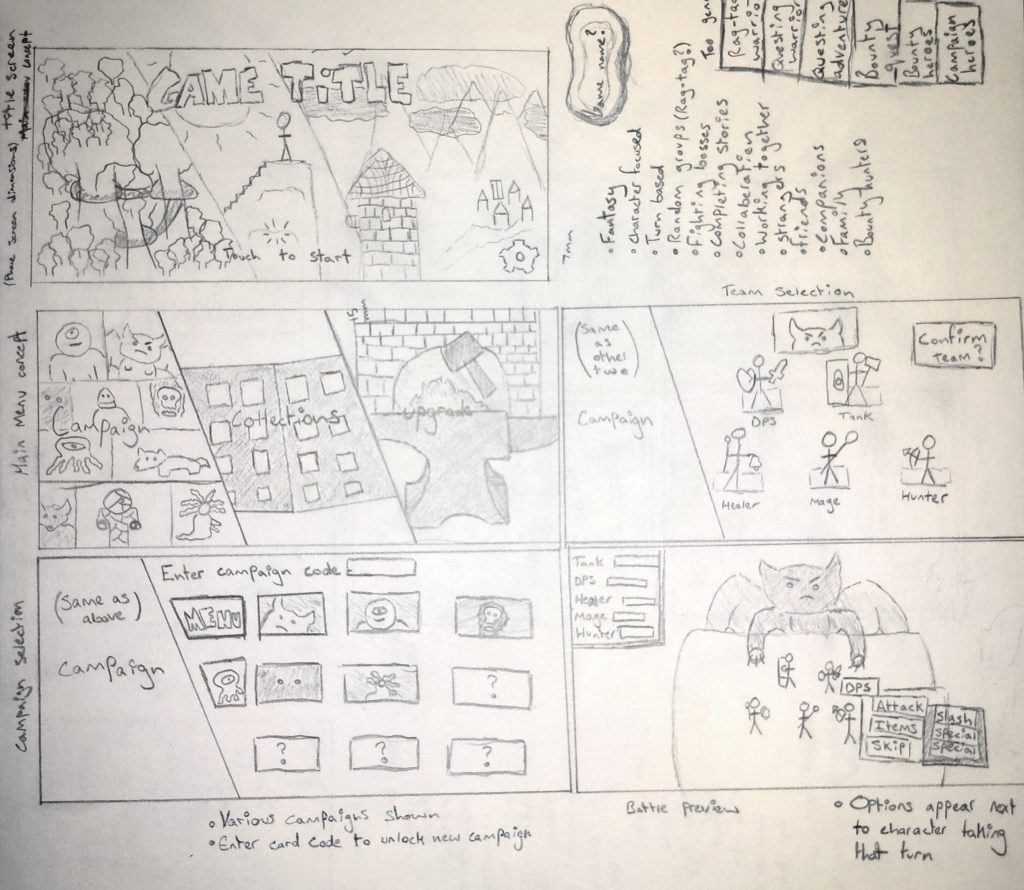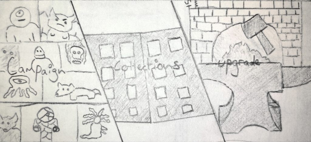 To progress the design of the prototype, I drew the dimensions of my phone out using a ruler and drew inside concepts of what screens would look like within the game. The screens I have drawn so far are the title screen, main menu, level selection, party selection and boss encounter. I will create a few more to make the navigation make sense for the prototype, rather than jumping through seemingly unconnected sections of the game.