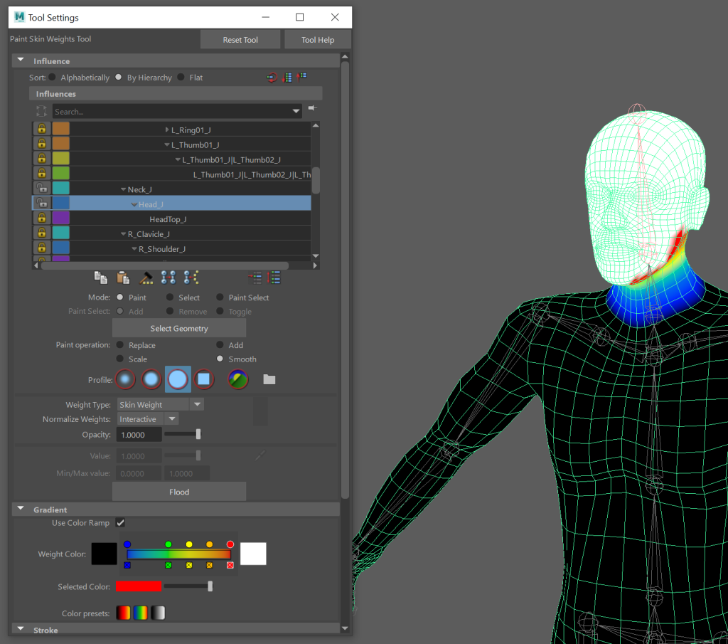 Vertex selecting the whole head section, I flooded Neck_J. I then vertex selected only the neck section and smoothed that to prevent deformation when the head is turned.
