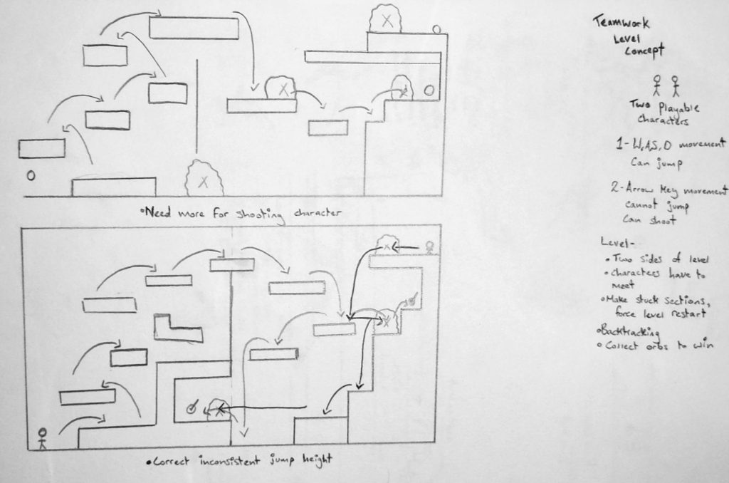 After settling on the two characters controlled by one player idea, I started drawing out level concepts. I knew that I wanted each character to have a unique ability so that they could work together. The level is designed in a way that each character must be used to aid the other.