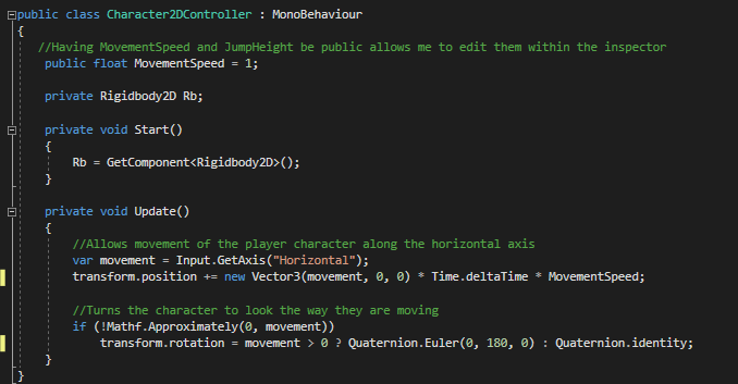 The movement scripts allows the player to move with A and S. This is placed on both characters so they move at the same time, although their speed values are different so they move at different speeds.