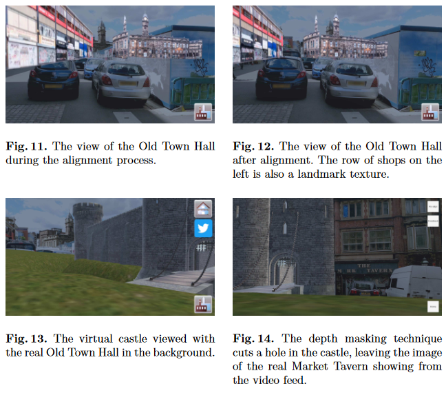 The main problem Leach, et al (2018) had re-creating the castle was that the original site is now covered with modern buildings. To overcome this problem, they used “A virtual model of the 3D area” (Leach, et al. 2018). Using this 3D model helped them deal with problems of overlaying the castle in location of the modern buildings, this is done by having “the user align … the model with the real world, giving a solid fix on position and orientation, before the virtual castle is displayed.” (Leach, et al. 2018). The output is then “overlaid on the mobile phone’s video feed” (Leach, et al. 2018) allowing the user to see the castle in it’s original location.