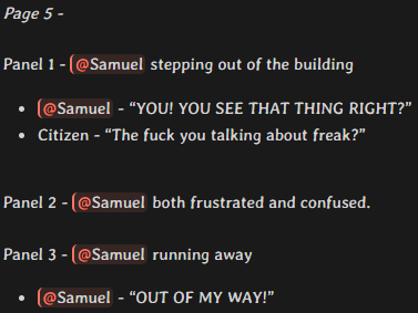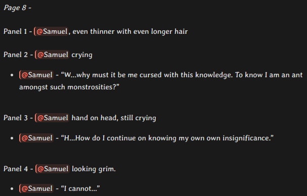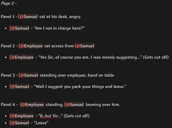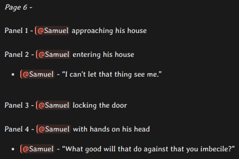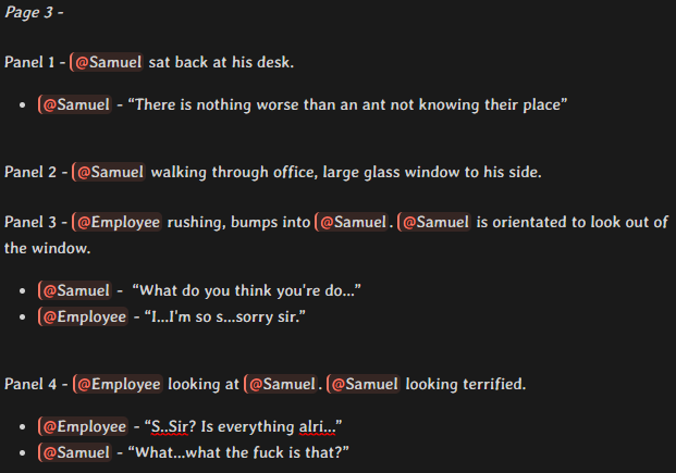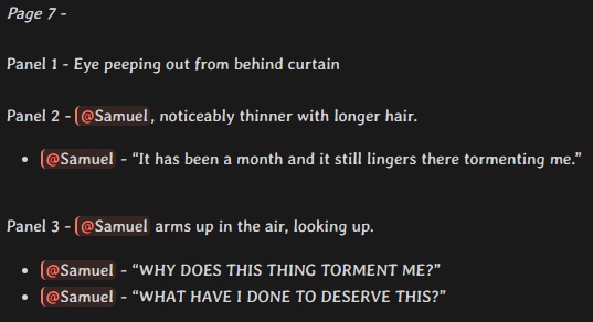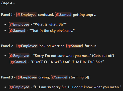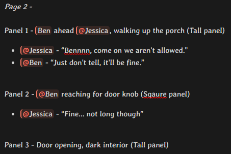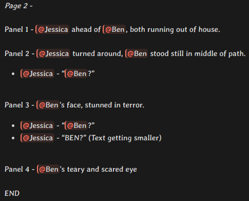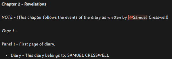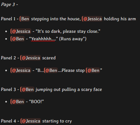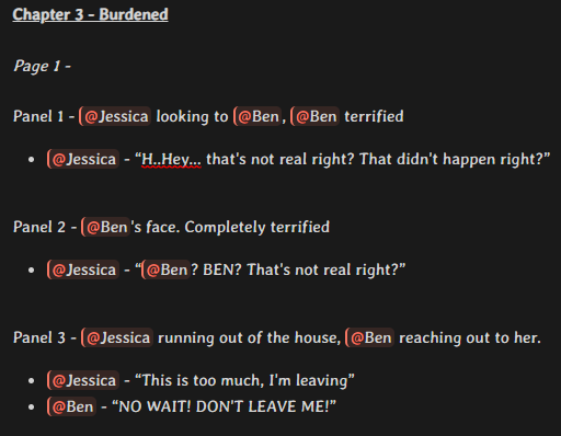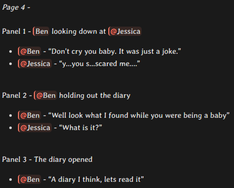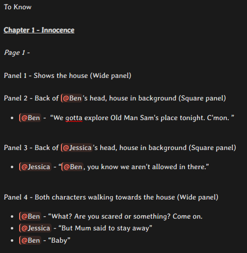 I have written out a draft of the script for my digital story, it is not yet finalized though the plot will not change. It is written somewhat similarly to that of a play script, though only loosely. I chose to do it in this format as it allowed me to easily sort by chapter, page and panel.